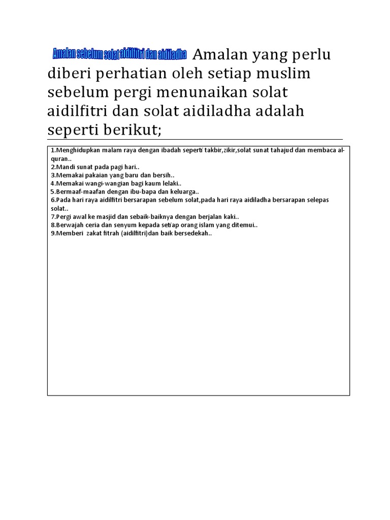 Solat Aidlfitri Dan Aidiladha from imgv2-2-f.scribdassets.com Hari raya aidilfitri tahun ini hadir namun sedikit berbeza daripada kebiasaan. Melaungkan takbir hari raya pada hari raya aidiladha, sunat bertakbir bermula maghrib pada malam hari raya sehingga imam bertakbiratul ihram untuk solat sunat hari raya aidiladha. Kita disunatkan untuk mandi sunat hari raya aidilfitri pada pagi syawal sebelum keluar ke masjid dengan niat kerana kedatangan aidilfitri. Kajian mendapati bahawa amalan solat berjemaah berpusat di rumah dan ketua keluarga memainkan peranan yang sangat penting dalam melaksanakannya. Memanfaatkan teknologi di hujung jari dengan 'raya online' amalan pemberian duit raya dalam kalangan masyarakat melayu sudah tidak asing lagi. Panduan solat fardhu dan sunat. Di sini ustaz akan menggariskan beberapa amalan sunah untuk kita lakukan di hari raya aidilfitri. Malah, lebih dari itu, kita mesti.